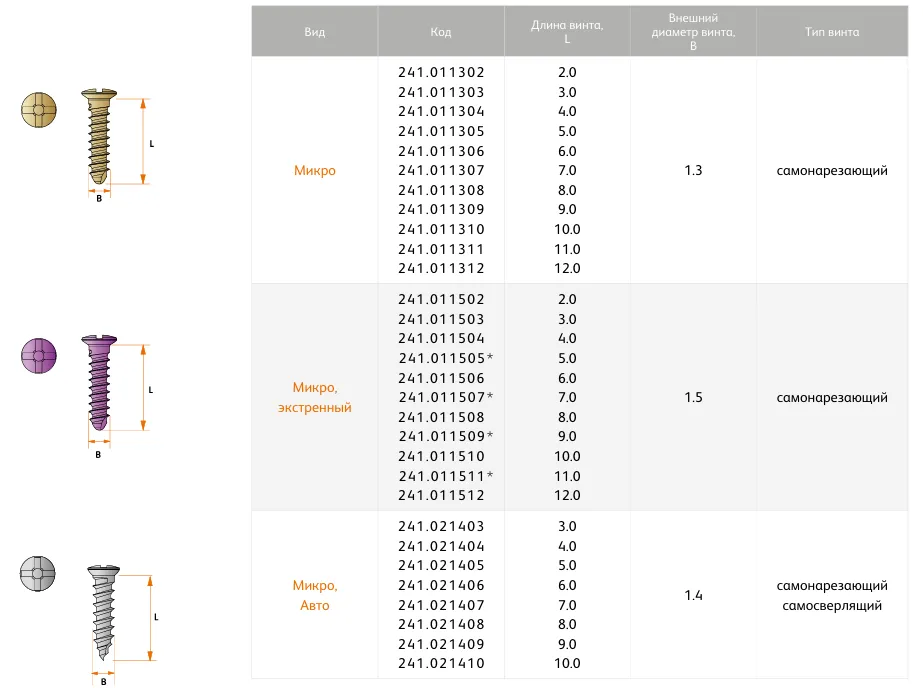 | Тип товара | Винты для ЧЛХ и Нейрохирургии |