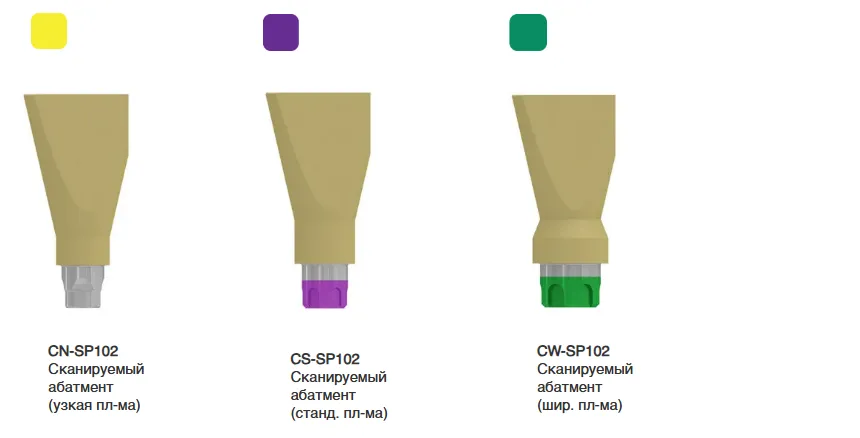 Запатентованная форма и уникальная поверхность сканируемых абатментов, позволяют использовать их без предварительной обработки специальным спреем. Сканируемые абатменты могут применяться как в лабораторном сканере, так и при внутриротовом методе сканирования. Сканируемые абатменты можно приобрести отдельно или набором MK-0057, включающим: 3 сканируемых абатмента на каждую ортопедичесую платформу, а 3 сканируемых абатменты для системы Мульти Юнит.