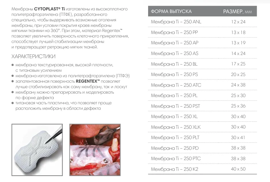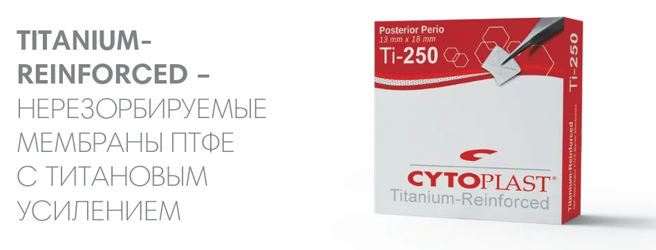 Cytoplast - плотный по структуре политетрафторэтилен (d-PTFE) является нерезорбируемым материалом и может использоваться в качестве барьерной мембраны для направленной костной регенерации. Использование Цитопласт d-PTFE помогает избежать некоторых потенциальных осложнений, которые могут возникнуть при использовании других типов изолирующих мембран. Область хирургического вмешательства при изоляции с использованием PTFE мембран не поддается инфицированию от 4 до 6 недель. Использование Cytoplast PTFE мембраны позволяет достичь устойчивых регенеративных результатов без первичного закрытия раны. Минимальный размер пор d-PTFE мембраны около 0,2 мкм, что не дает бактериям проникать в костную ткань через барьер мембраны Cytoplast. Стоматологическая мембрана с титановым усилением RPM более удобна в моделировании и адаптации. RPM Ti150 по форме аналогичны мембранам Ti250. Отличаются толщиной - 150 мкн и 250 мкн соответственно. Купить резорбируемые и нерезорбируемые мембраны Cytoplast по низкой цене у официального дилера Osteogenics Inc.