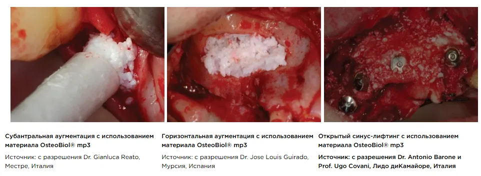 Еще одно показание к использованию mp3 – горизонтальная аугментация кости в области двухстеночных дефектов. В данном случае материал применяется в сочетании с блоком аутогенной кости или костной пластиной OsteoBiol® Cortical Lamina. Кортикально-губчатая костная смесь постепенно резорбируется остеокластами; почти с той же скоростью образуется новая кость. Уникальные свойства биоматериала дают возможность для прекрасной стабильности аугментата, благоприятствуют процессу образования здоровой кости и благополучному проведению имплантологической реабилитации.