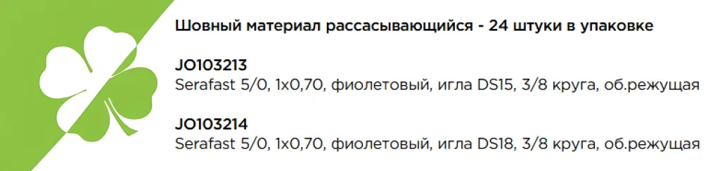 SERA FAST был разработан для дополнения нашего ассортимента синтетических рассасывающихся шовных материалов. SERA FAST ® является правильным выбором для показаний с коротким временем заживления ран, когда важны все преимущества монофиламентных шовных материалов.